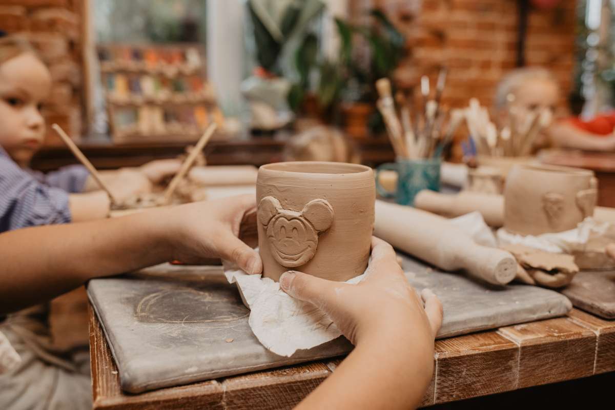 Ручку и героя делаем вручную. Ручки тоже бывают разной формы, и вы выбираете, какая больше понравится. Персонажа мы делаем с помощью штампа. Кстати, у каждого героя есть свой артефакт - это маленький предмет, связанный с его историей. Например у Винни Пуха горшочек с медом, у миньонов - их любимые бананы, а у Гарри Поттера - золотой снитч. Когда кружка собрана, нужно доработать персонажа - раскрашиваем его сами, на мастер-классе!