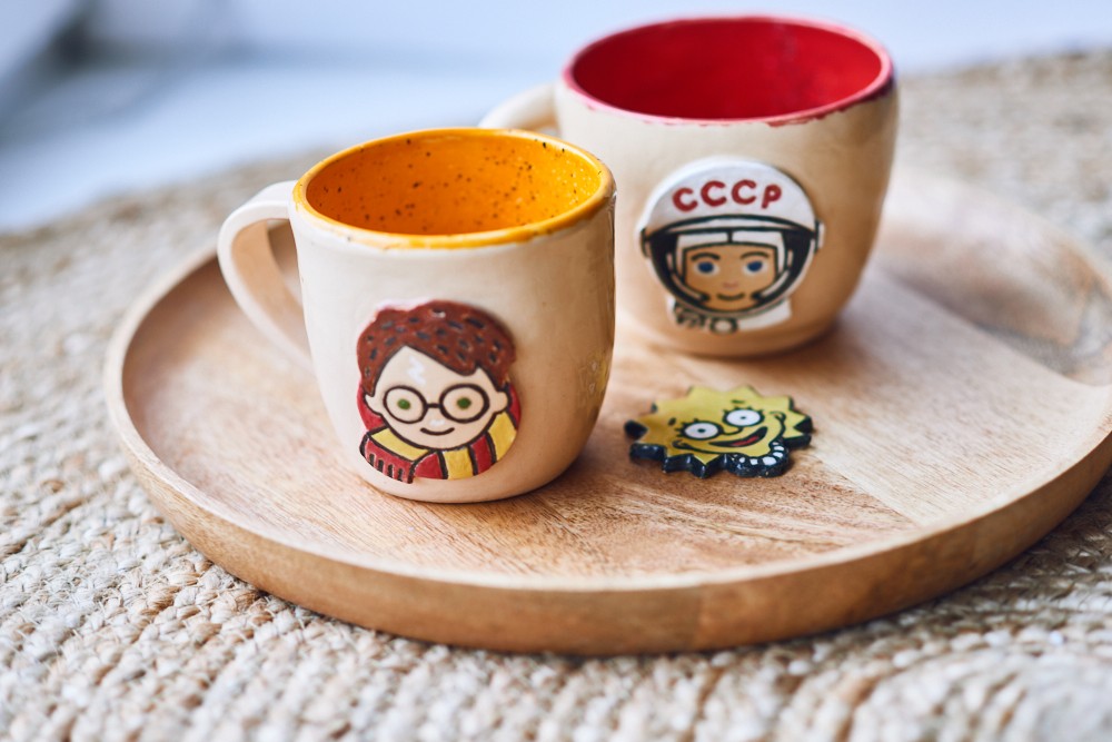 После этого изделия отправляются сушиться и ждать дальнейшего обжига. И чтобы кружками можно было пользоваться - мы покрываем их глазурью. Палитра просто огромная, в ней есть самые разные цвета, оттенки и эффекты. Покрытие предназначено для контакта с горячими и холодными напитками. Поэтому если у вас есть любимый персонаж, и вам приятно его видеть почаще - приходите крутить кружку! А еще ее можно подарить близкому, если вы знаете его кумира, и это будет 100% особенный сюрприз!
